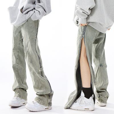 夏の黄泥色の大衆は古い水洗い側にジッパージーンズを開けた男女の新型ストレートが痩せている