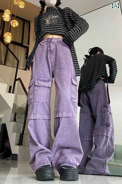 デニムパンツ ストリート ワイド レディース アメリカン レトロ パープル ワイドレッグ ワーク ジーンズ 女性用 ハイウエスト スリム ストレート パンツ デニム ウォッシュ加工 複数のポケット | koookooo