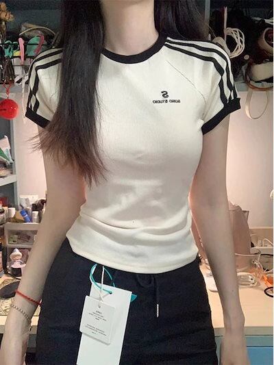 2025春夏 Tシャツ レディース 半袖 韓国風 プリント ショート丈トップスセクシースポーツミックサイドスストリートおしゃれ系グラフィックラウンドネックスリーブカジュアル大人可愛いスポーティー配色T | koookooo