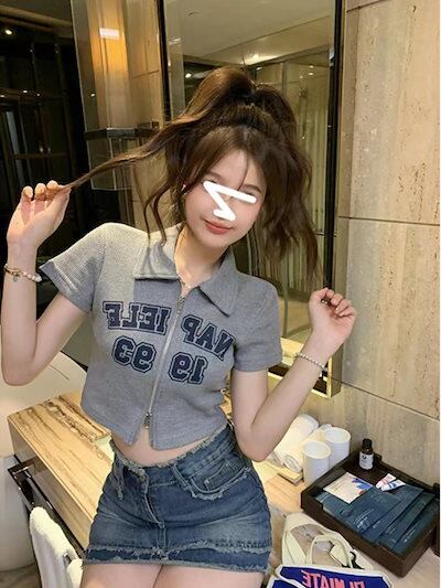 2025春夏 Tシャツ レディースワッフル半袖 韓国風 プリント ショート丈 トップスダブルスポーツミックスストリートおしゃれ系グラフィックラウンドネックスリーブカジュアル大人可愛いスポーティー配色T | koookooo