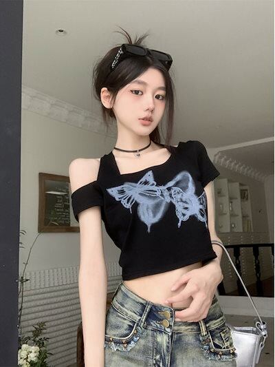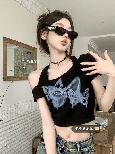 2025春夏 Tシャツ レディース 半袖 韓国風 プリント ショート丈 トップス スポーツミックスストリートフィット感おしゃれ系肩出しラウンドネックスリーブカジュアル大人可愛いスポーティー配色T | koookooo