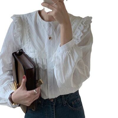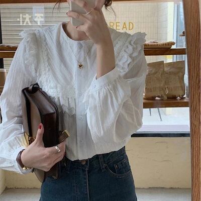 新作韓国ファッションレディース 無地 シャツ 通勤 レース 気質ウエストを収めたスリムネックシャツ長袖ブラウス