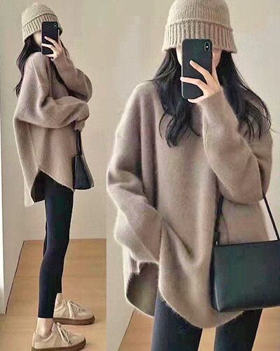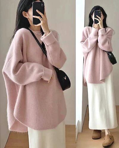 【急速出荷!】ふわふわ ラウンドヘム ニット 長袖 レディース セーター 丸首 クルーネック もこもこ モヘア おしゃれ 流行 可愛い きれいめ 上品 カジュアル プチプラ 韓国ファッション | koookooo
