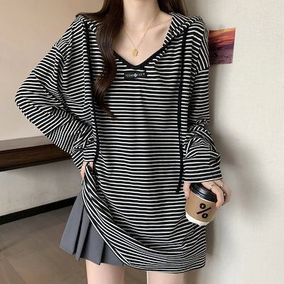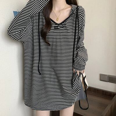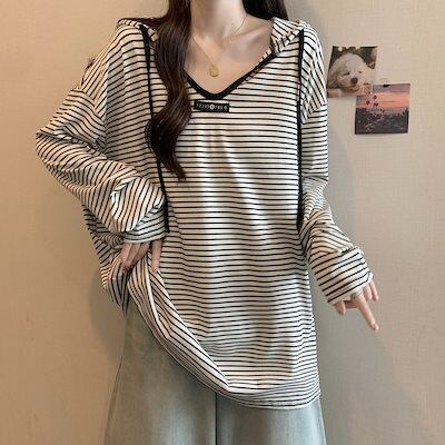 本日の限定商品Vネックボーダーフード付き長袖Tシャツ 春秋ルーズカジュアルトップス スウェット スエット ロンT ロングTシャツ ロンティー トレーナー 長袖tシャツ レディース tシャツ 長袖 レデ | koookooo