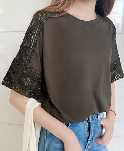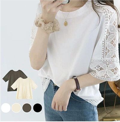 Tシャツ韓国ファッション 新作トップス レース 透かし彫り tシャツ Tシャツ レディース シャツ 半袖 Tシャツ セミロング丈 Tシャツ