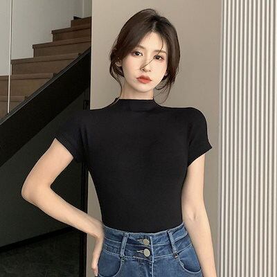 Tシャツ韓国ファッション 新作トップス 立ち襟 タイト 着痩せ 百掛け ノ一スリ一ブ tシャツ ロング Tシャツ 半袖 Tシャツ 半袖 レディース