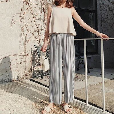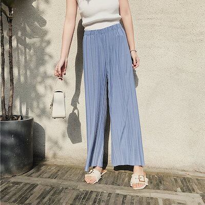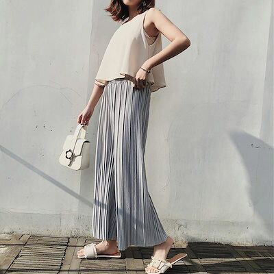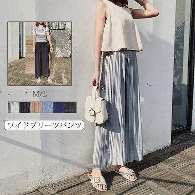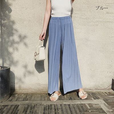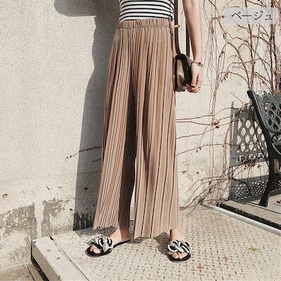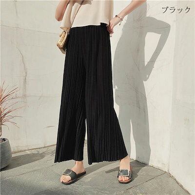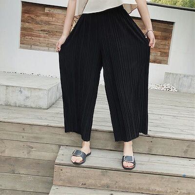 パンツ レディース 夏 ワイドパンツ ハイウエスト プリーツ ガウチョパンツ シフォン ボトムス プリーツパンツ ロングパンツ パンツ ワイド ウエストゴム 無地 黒 大きいサイズ ゆったり 楽ちん | koookooo