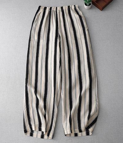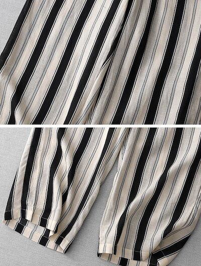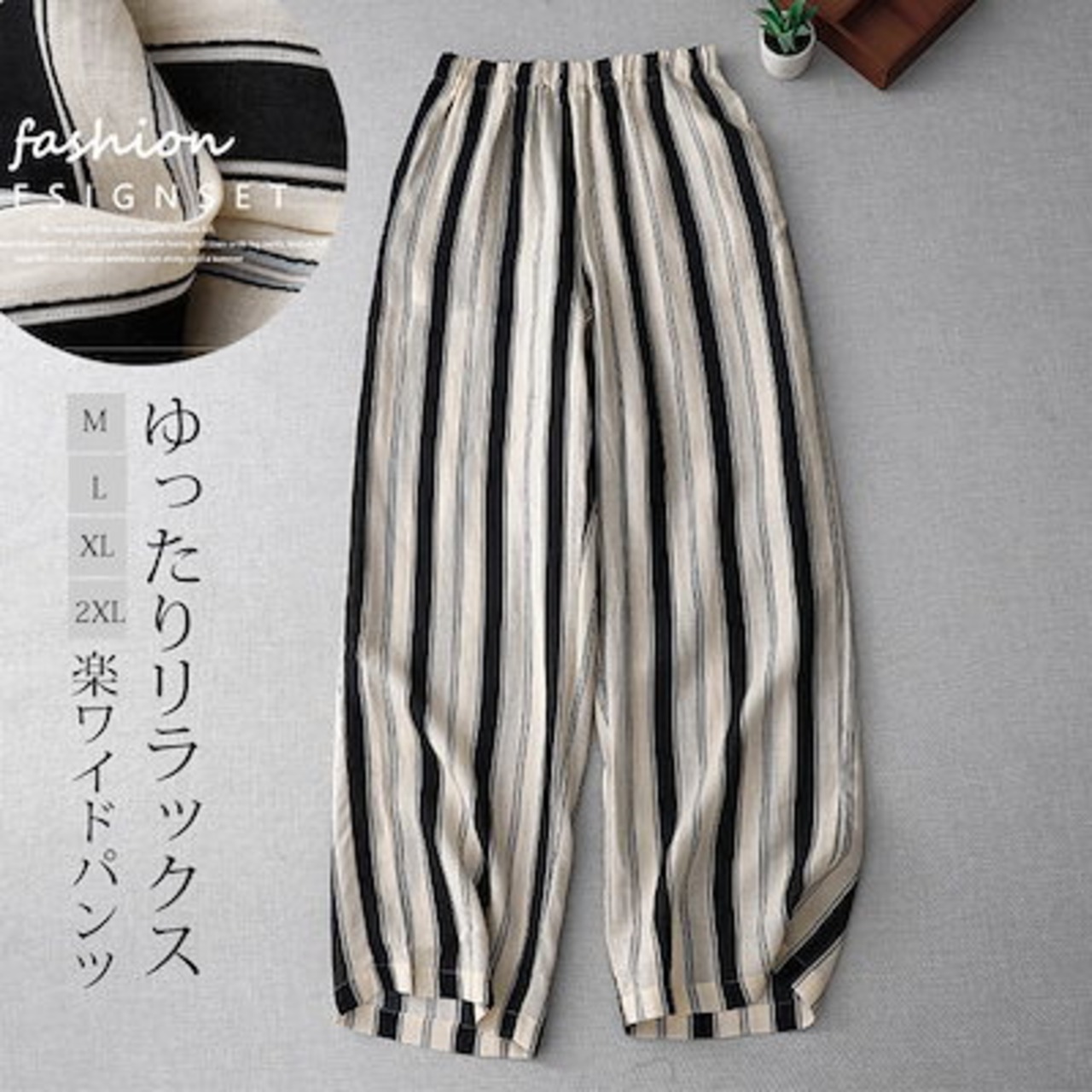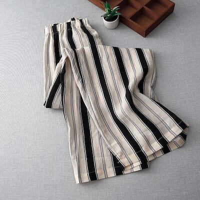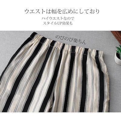 ワイドパンツ 夏 レディース パンツ ワイド ストライプ ガウチョパンツ ボトムス ハイウエスト ウエストゴム 柄 きれいめ ナチュラル 大きいサイズ ロングパンツ 総柄 ポケット 落ち感 ゴム スト | koookooo