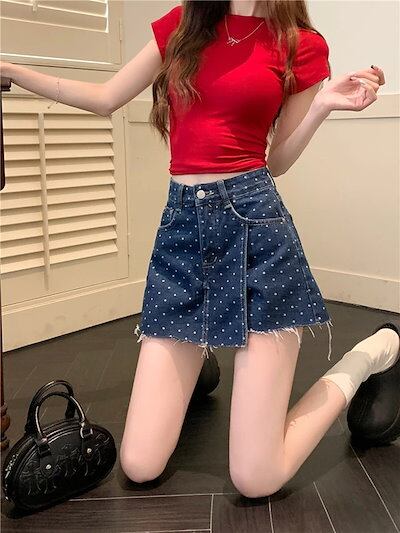 お出かけ レディース 韓国ファッション ガーリー キュート かわいい おしゃれ 夏 細見え 脚長効果 美脚効果 ハイウエスト ドット柄 Aライン デニム ショート丈 キュロット 2025春夏パンツ