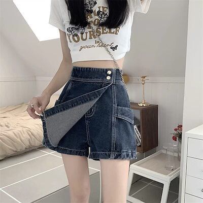 脚見せショートパンツ ハイウエストイレギュラーデニムショートパンツレディース夏薄手パンツスカート