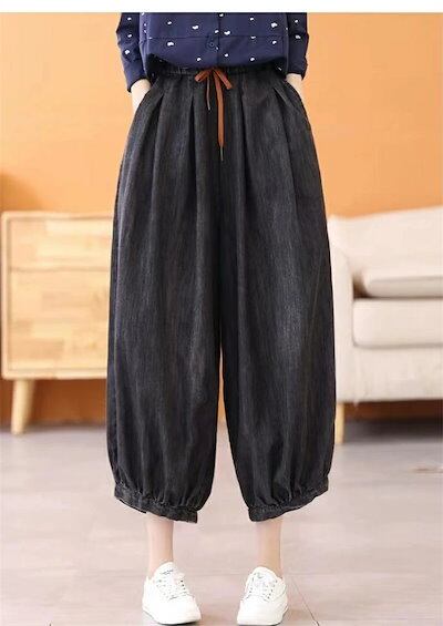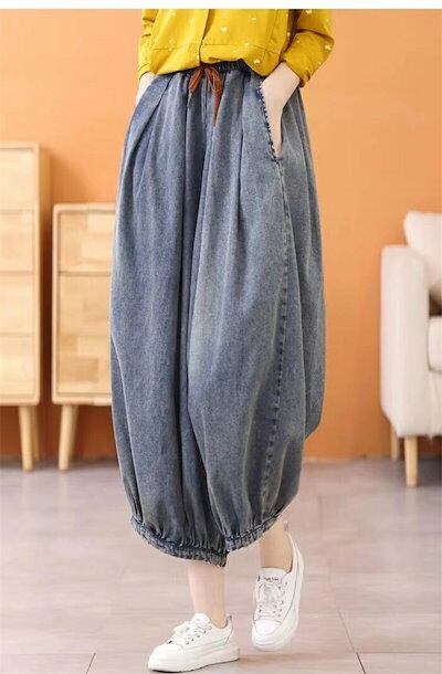 バルーンパンツ サルエルパンツ レディース デニムパンツ 七分丈 ワイドパンツ ボトムス 7分丈パンツ ワイド 長ズボン ウエストゴム パンツ デニム 体型カバー 総ゴム ズボン ワイドパンツ バギー | koookooo