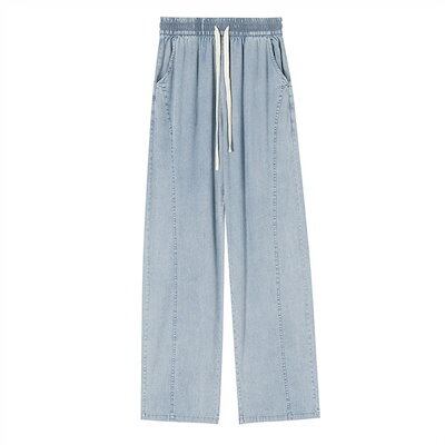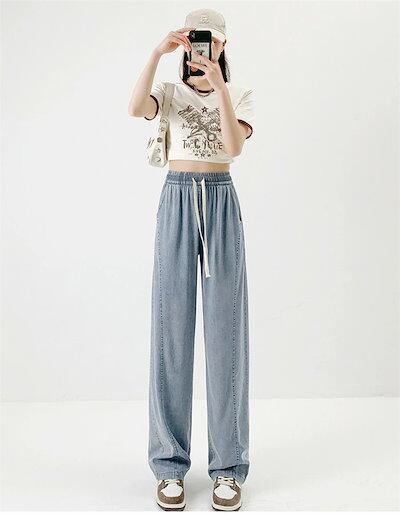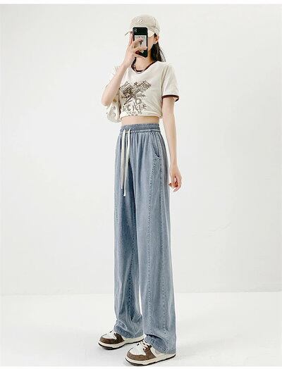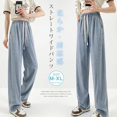 デニムワイドパンツ 清涼感 夏 ワイドパンツ レディース ジーンズ ボトムス 冷感素材 リラックス ウエストゴム ジーパン 薄手 長ズボン バギーパンツ イージーパンツ 涼しい 爽やか ロングパンツ | koookooo