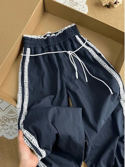 レディース ネイビーブルー ワイドレッグ カジュアルパンツ コントラストレーストリム付き - 伸縮性ウエストバンドルーズフィット軽量ポリエステル素材春夏に