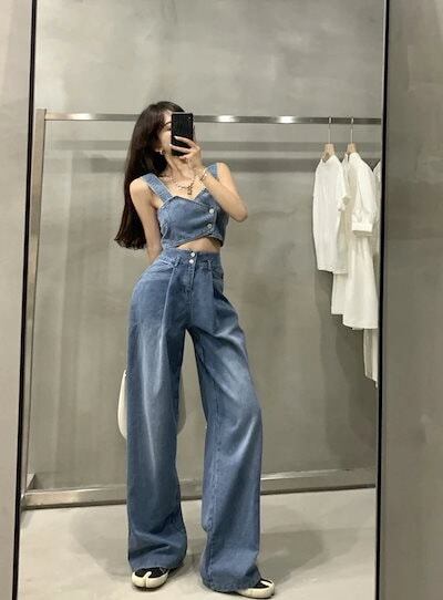 夏 パンツサマースタイルのレトロデニムショートベストハイウエストモッピングワイドレッグパンツファッションツーピ ワイドパンツ