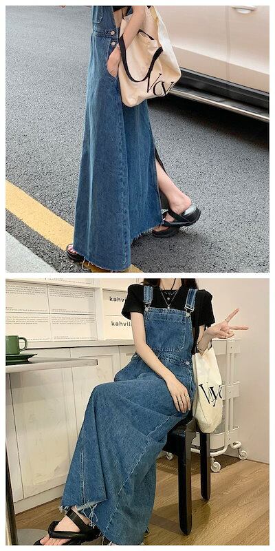 デニム キャミワンピース 春夏 ジャンパースカート サロペット 春 夏 きれいめ ノースリーブ ロング ワンピース マキシワンピース オールインワン 大人 フレア 無地 体型カバー ゆったり 重ね着 | koookooo