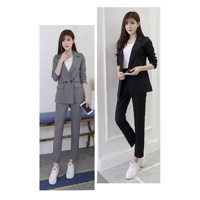 レディース スーツ 長袖 2点セット ジャケット 無地 パンツスーツ 大人 ウエストゴム 通勤 ビジネス フォーマル オフィス カジュアル 秋春