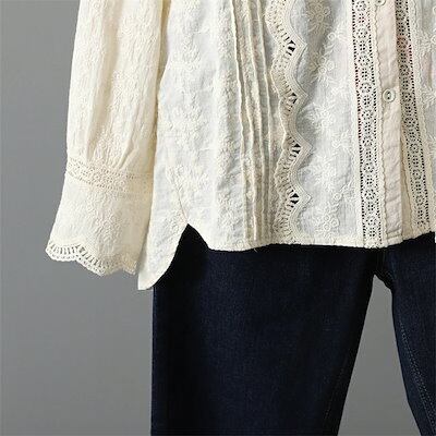 【急速出荷!】レース シャツ ブラウス シャツトップス レディース 春夏 長袖 立ち襟シャツ 花柄 刺繍 透け感 スタンドカラー 長袖ブラウス 前開き ボタン 薄手 きれいめ ゆったり 大きいサイズ | koookooo