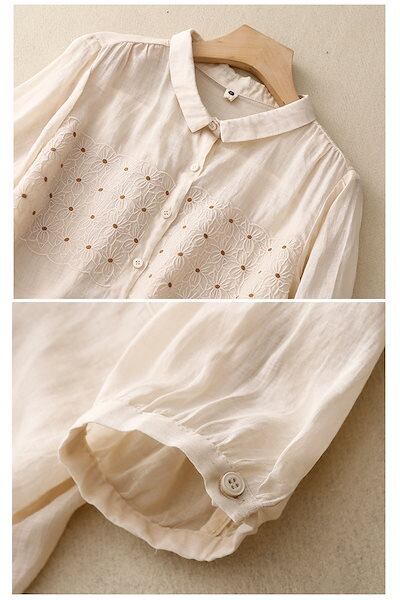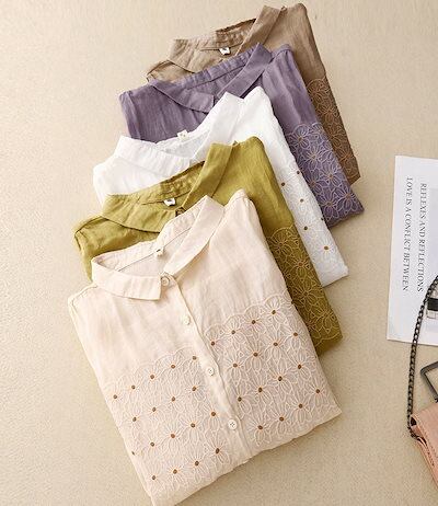 半袖シャツ レディース 刺繍シャツ 綿麻風 刺繍 花柄 シャツ ブラウス 半袖 折り襟 トップス ボタン 体型カバー ゆったり シャツブラウス シンプル 夏 春 夏シャツ 前開き ブラウス おしゃれ | koookooo