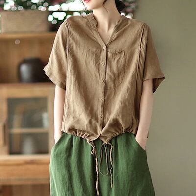 半袖シャツ シャツ ブラウス レディース 半袖ブラウス 白シャツ Vネック 半袖 春夏 前開き ボタン 立ち襟 ポケット付き 無地 シャツブラウス 裾紐付き 大きいサイズ ゆったり トップス 体型カバ