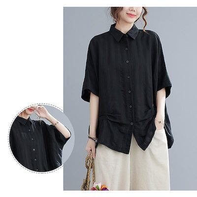 シャツ レディース 半袖 夏 白 黒 おしゃれ 五分袖 黒シャツ 白シャツ ゆったり ドルマンスリーブ シャツブラウス ドロップショルダ とろみ 折り襟 開襟 トップス 春 夏 秋 リブー ボタン 前