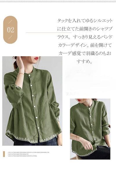 シャツ レディース 七分袖 オシャレ シャツブラウス バンドカラー キャザー 半袖シャツ 襟付き 前開け ボタン止め バルーン袖 綿シャツ おしゃれ コットン ゆったり トップス 大きいサイズ 刺繍