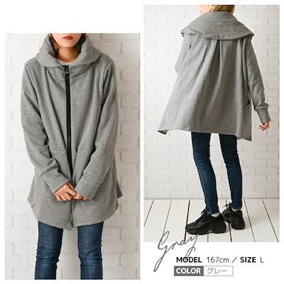 ビッグパーカーコート 裏起毛 ロング丈 ジップアップ レディース 大きめファスナー デカ襟 長袖 防寒 アウター 上着 フード付き フーディー 冬