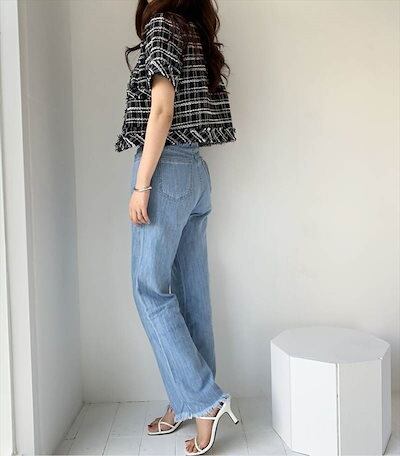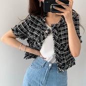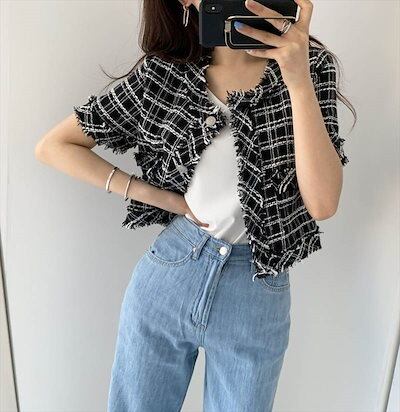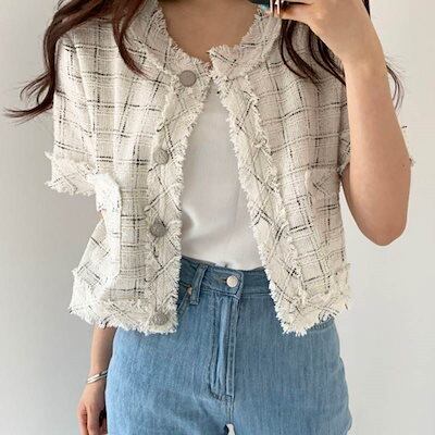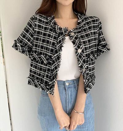 トップス レディース ジャケット アウター ツイード 袖あり 半袖 ラウンドネック 襟なし 大人 可愛い かっこいい チェック柄 上品 おしゃれ きれいめ フェミニン エレガント カジュアル ビジネス | koookooo