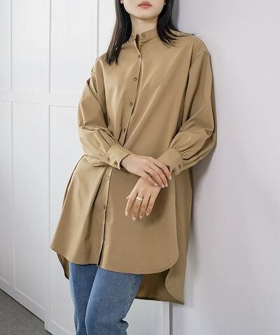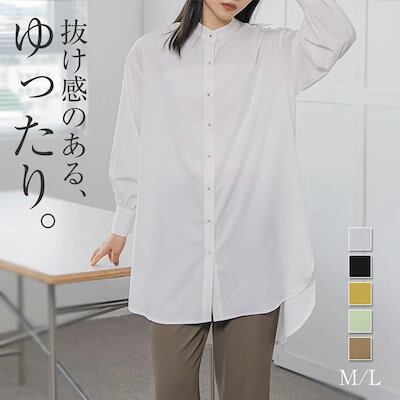 シャツブラウス レディース 長袖 ブラウス 春 秋 トップス チュニック ミディアム丈 ロング 体型カバー お尻が隠れる 無地 長袖 ギャザー パフスリーブ 襟 カジュアル シンプル 楽チン きれいめ | koookooo