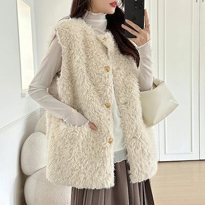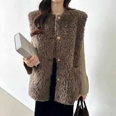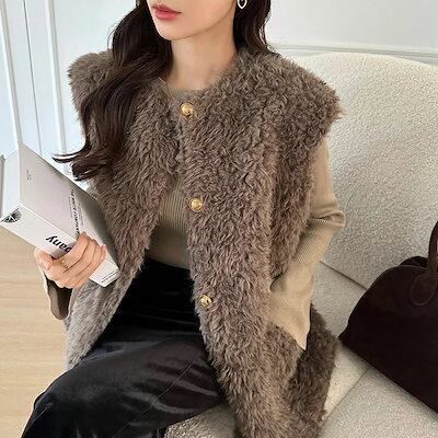 [ 即日発送]ボアベスト 金ボタン シープ ボア もこもこ ファー ベスト ジレ レディース ボタン 前開き トップス クルーネック ファーベスト コーデ おしゃれ アウター 暖かい ジャケット ポケ | koookooo