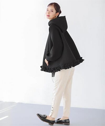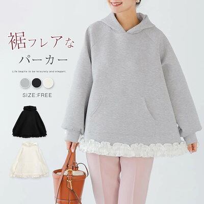 パーカー スウェット レディース 春 秋冬 レーナー フリル トップス 長袖 プルオーバー フード付き フレア チュニック アウター フーディー ゆったり 体型カバー おしゃれ 無地 シンプル ポケッ | koookooo