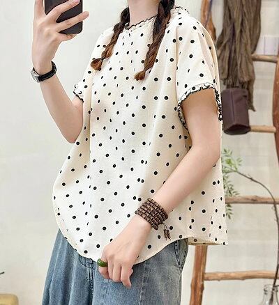 前後2way ブラウス ドット シャツ レディース フレンチスリーブ 水玉 コットン 綿 夏シャツ フリル襟 トップス ボタン 前開き 後ろ開き きれいめ ゆったり 体型カバー シンプル 大人 かわい