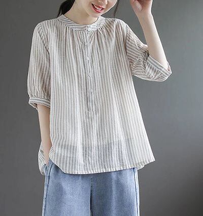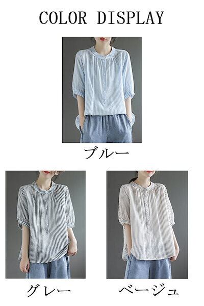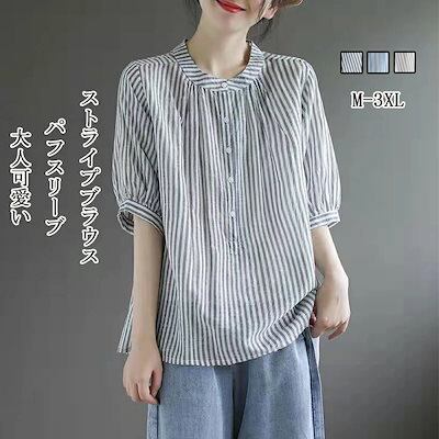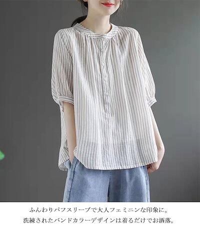 ストライプ ブラウス レディース 春夏 tシャツ パフスリーブ シャツブラウス 半袖 バンドカラー ボタン タック 綿混 ギャザー トップス ゆったり 大きいサイズ 体型カバー Tシャツ 通気性 涼し | koookooo