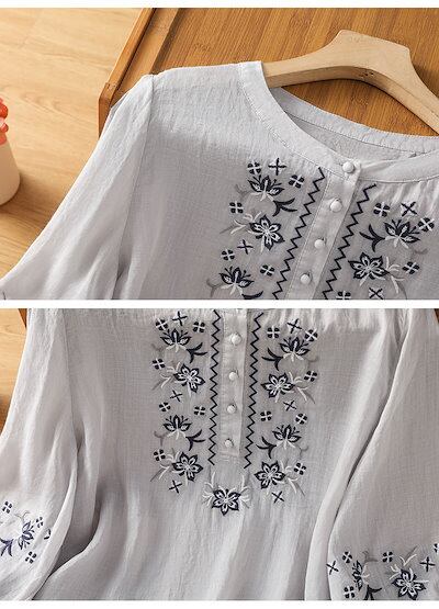 シャツブラウス レディース 刺繍シャツ 綿麻風 刺繍 シャツ ブラウス 7分袖 トップス ボタン 体型カバー ゆったり シンプル 夏 春 夏シャツ 刺繍ブラウス プルオーバー おしゃれ 柔らかい 通気 | koookooo