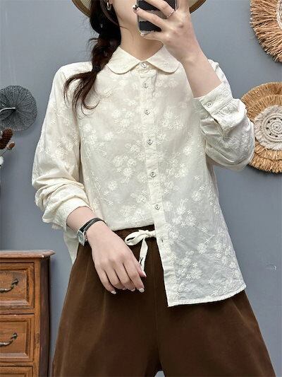 長袖 ブラウス トップス 刺繍 シャツ レディース 春 チュニック 長袖ブラウス 長袖トップス 綿 コットン 花柄 シャツブラウス 前開き ボタン留め 夏 丸襟 刺繍ブラウス 刺繍シャツ ゆったり 通 | koookooo