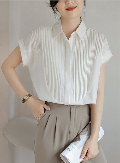 半袖 シャツ ブラウス レディース シャツブラウス 半袖ブラウス 半袖シャツ トップス 半袖トップス ピンタック タック チュニック 夏 折り襟 ゆったり 前開き ボタン留め 白シャツ ホワイト き | koookooo