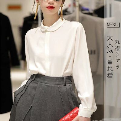 白 襟付き シャツ レディース 長袖 オフィス 上質 ブラウス フォーマル 丸襟 長袖シャツ ふんわり 柔らかい 軽い シャツブラウス 黒 グレー 白シャツ ボタン隠し カジュアルシャツ オフィスシャ