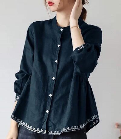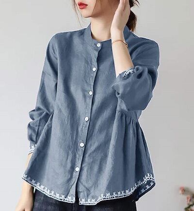 シャツ レディース 七分袖 オシャレ シャツブラウス バンドカラー キャザー 半袖シャツ 襟付き 前開け ボタン止め バルーン袖 綿シャツ おしゃれ コットン ゆったり トップス 大きいサイズ 刺繍 | koookooo