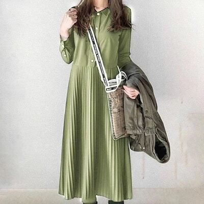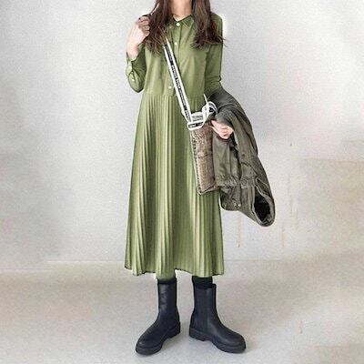 【急速出荷!】シャツワンピース 秋 冬 きれいめ 長袖 ロング ワンピース レディース 長袖 プリーツワンピース シャツワンピ ロングワンピース ミモレワンピース 無地 ゆったり 体型カバー 着痩せ | koookooo
