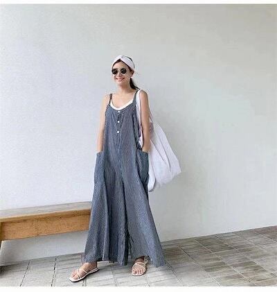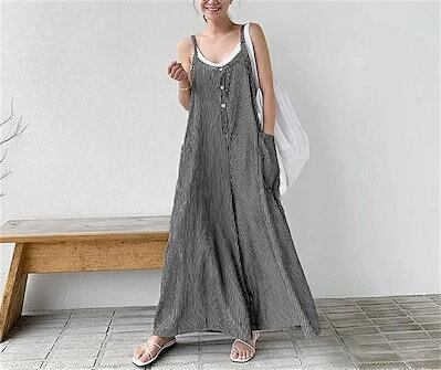 オールインワン サロペット レディース キャミサロペット ワイドパンツ 体型カバー ゆったり 大きいサイズ 大人 重ね着 可愛い オーバーオール ストライプ ガウチョパンツ マタニティ オフィス カジ | koookooo
