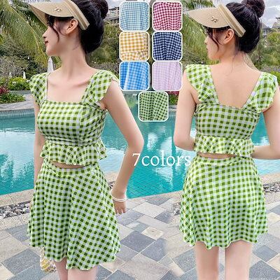 【2025新作】二点セット セパレート水着 チェック 可愛い 着痩せスリム見え レディース 水着 夏 韓国ファッション ゆったり 高校生 中学生 大きいサイズ 紫外線対策