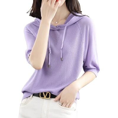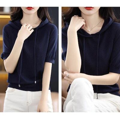 半袖パーカー レディース 春夏 ニットソー カットソー ニットパーカー 超人気 涼しい プルオーバー フーディー フード付き 半袖 サマーニット