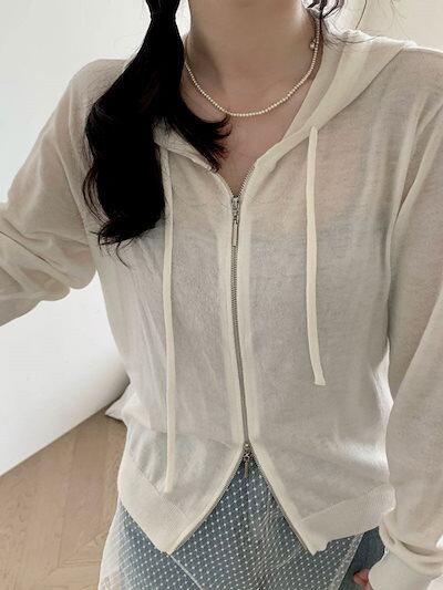カーディガン レディース 春夏 秋 薄手 シアー カーディガン ショート トップス ニットカーディガン 透かし編み フード付き ジップ ダブルジップ パーカー uv きれいめ 羽織 羽織もの 冷房対策 | koookooo