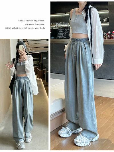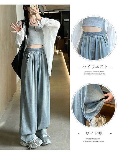 デニムパンツ レディース ウエストゴム デニム 春夏 ワイドパンツ ハイウエスト パンツ ズボン ボトムス ロングズボン ゆったり ワイド カジュアル ポケット付き きれいめ ストレート | koookooo