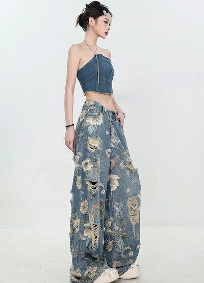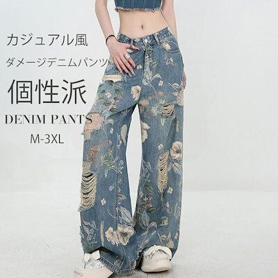 ダメージ デニム ワイド パンツ レディース デニムパンツ ワイドパンツ ワイドデニム ボトムス ボトム 柄 花柄 個性 ストレート ジーンズ ロング丈 ストレートパンツ カジュアル 春 | koookooo