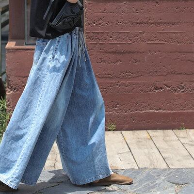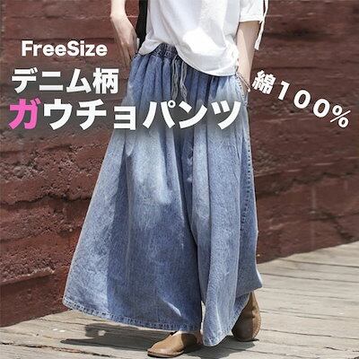 ガウチョパンツ デニム ワイドパンツ レディース 綿100% デニムパンツ ワイドパンツ デニム スカーチョ スカンツ コットン ポケット付き 大きめ 楽ちん 無地 春 秋 大人 おしゃれ | koookooo