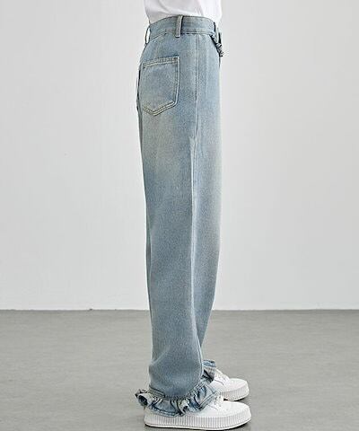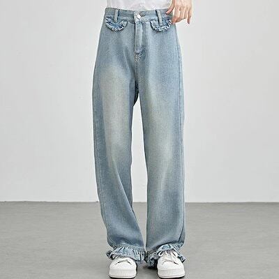 ハイウエスト セミワイド フリル デニム パンツ 女性 レディース ボトム ズボン ジーンズ Gパン 春 夏 秋 冬 脚長効果 フレア カジュアル アクティブ デイリー 定番 可愛い キュート ガーリ | koookooo