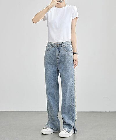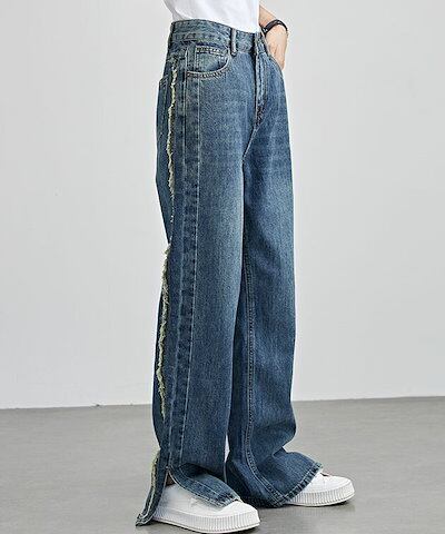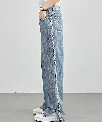 サイド フリンジ スリット ストレート デニム パンツ 女性 レディース ボトム ズボン 春 夏 秋 冬 Gパン ヴィンテージ レトロ セミワイド ゆるコーデ カジュアル デイリー アクティブ 着まわ | koookooo