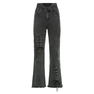 デニムボトムス ジーンズ ニッチデザイン レースアップ ジーンズ レディース イン 春 ファット ハイウエスト スリム スリット ワイドパンツ 潮