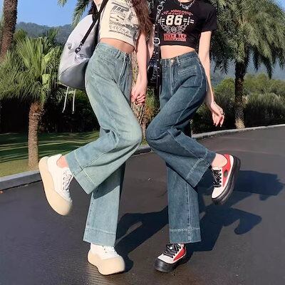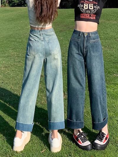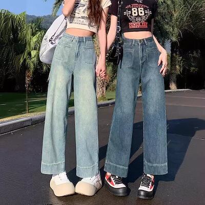 ビッグサイズ レトロ ライト カラー デニム レディース 夏 ハイウエスト 痩せ見え ゆったり 低身長 ストレート ワイドレッグ ロングパンツ