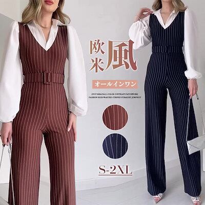 オールインワン ストラップ 長袖 秋冬 春秋 パンツドレス ロングパンツ レディース オーバーオール Vネック ハイウエスト ワイドパンツ フェミニン 結婚式 OL 高級感 上品 入学式 卒業式 おし | koookooo